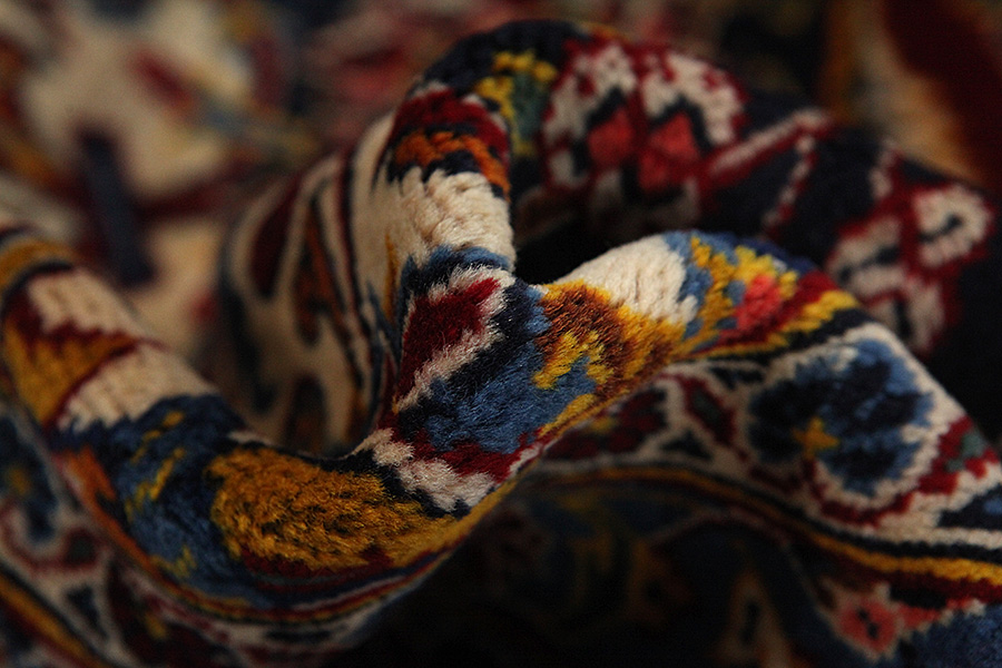 Abrash: Auf Grund des unterschiedlichen Wollfettgehalts und der unterschiedlichen Salzmenge während des Färbungsprozesses, hat die Wolle eine unterschiedliche Farbaufsaugfähigkeit. Vor dem Weben ist es nicht so sichtbar. Aber beim Weben entstehen Reihen mit unterschiedlichen Farbabstufungen der gleichen Farbe. Dies heißt Abrash und verdeutlicht die Natürlichkeit und die Originalität der Wolle, die mit keinen chemischen Mitteln behandelt wurde. Beispiele