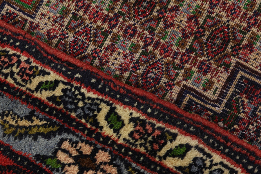 Abrash: Auf Grund des unterschiedlichen Wollfettgehalts und der unterschiedlichen Salzmenge während des Färbungsprozesses, hat die Wolle eine unterschiedliche Farbaufsaugfähigkeit. Vor dem Weben ist es nicht so sichtbar. Aber beim Weben entstehen Reihen mit unterschiedlichen Farbabstufungen der gleichen Farbe. Dies heißt Abrash und verdeutlicht die Natürlichkeit und die Originalität der Wolle, die mit keinen chemischen Mitteln behandelt wurde. Beispiele