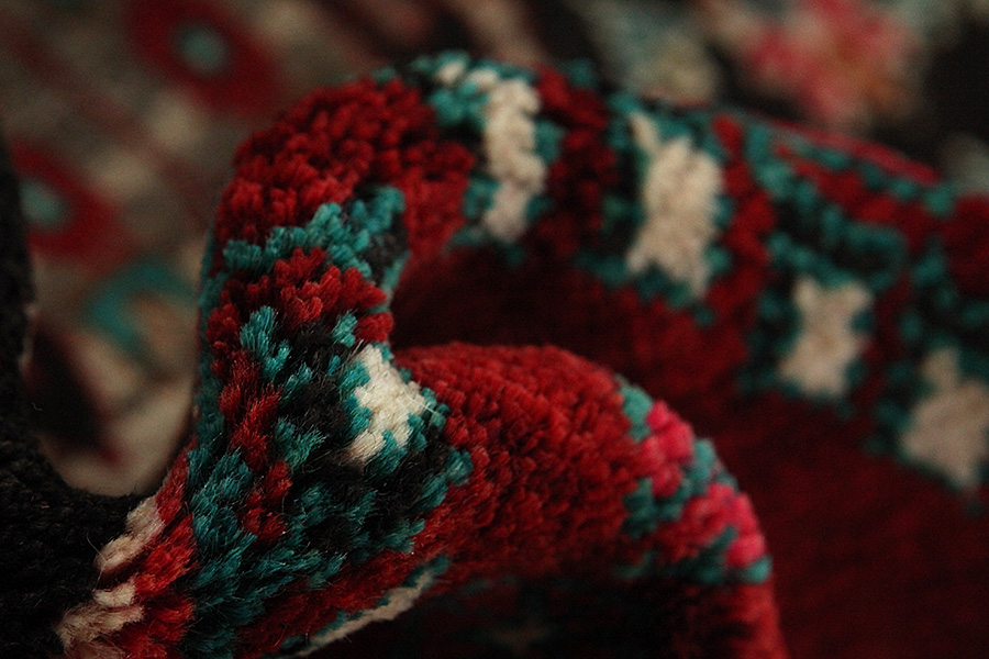Abrash: Auf Grund des unterschiedlichen Wollfettgehalts und der unterschiedlichen Salzmenge während des Färbungsprozesses, hat die Wolle eine unterschiedliche Farbaufsaugfähigkeit. Vor dem Weben ist es nicht so sichtbar. Aber beim Weben entstehen Reihen mit unterschiedlichen Farbabstufungen der gleichen Farbe. Dies heißt Abrash und verdeutlicht die Natürlichkeit und die Originalität der Wolle, die mit keinen chemischen Mitteln behandelt wurde. Beispiele