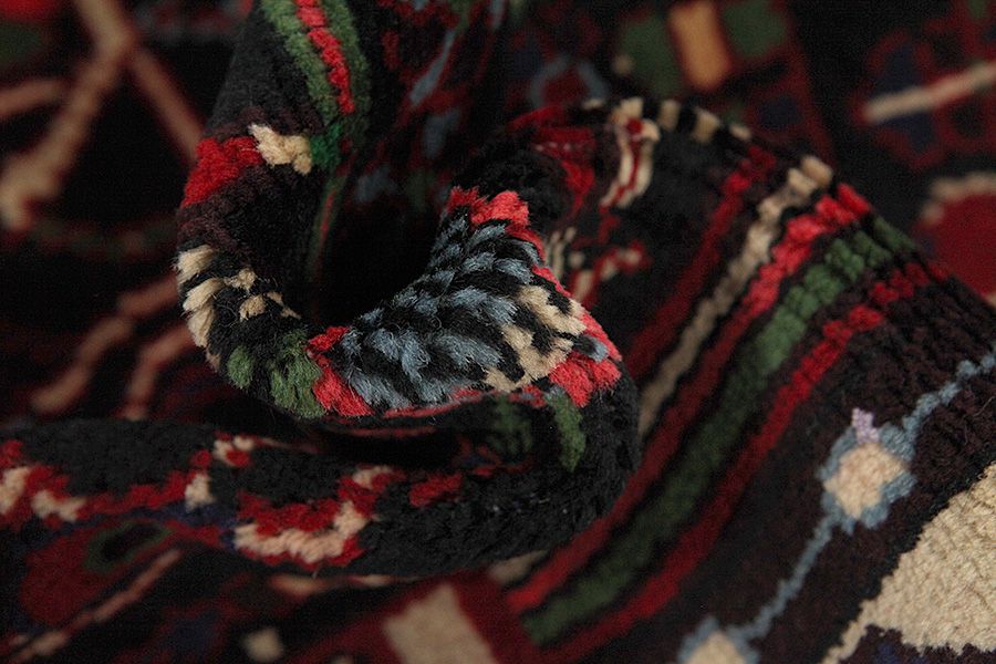 Abrash: Auf Grund des unterschiedlichen Wollfettgehalts und der unterschiedlichen Salzmenge während des Färbungsprozesses, hat die Wolle eine unterschiedliche Farbaufsaugfähigkeit. Vor dem Weben ist es nicht so sichtbar. Aber beim Weben entstehen Reihen mit unterschiedlichen Farbabstufungen der gleichen Farbe. Dies heißt Abrash und verdeutlicht die Natürlichkeit und die Originalität der Wolle, die mit keinen chemischen Mitteln behandelt wurde. Beispiele